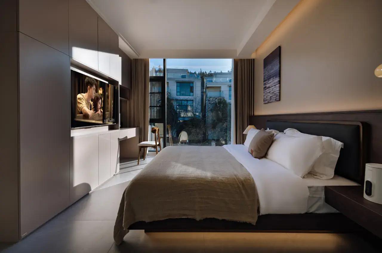 【智能客控】——别墅内全面配备先进的智能控制系统,一键即可轻松调节室温、灯光及窗帘,让科技为您的度假生活增添便捷与乐趣。每间客房均配置席梦思床垫,保证您夜间的深度睡眠;巨幕投影设备则为您打造私人影院般的观影体验。此外,汉斯格雅卫浴系统的引入,配以轻奢浴缸,让您在沐浴时也能悠享高品质生活。部分客房更设有旅拍露台,让您随时捕捉苍山洱海的绝美瞬间;置物衣橱、悠闲一角以及mini冰箱等贴心设施,无不体现出我们对细节的关注与用心。