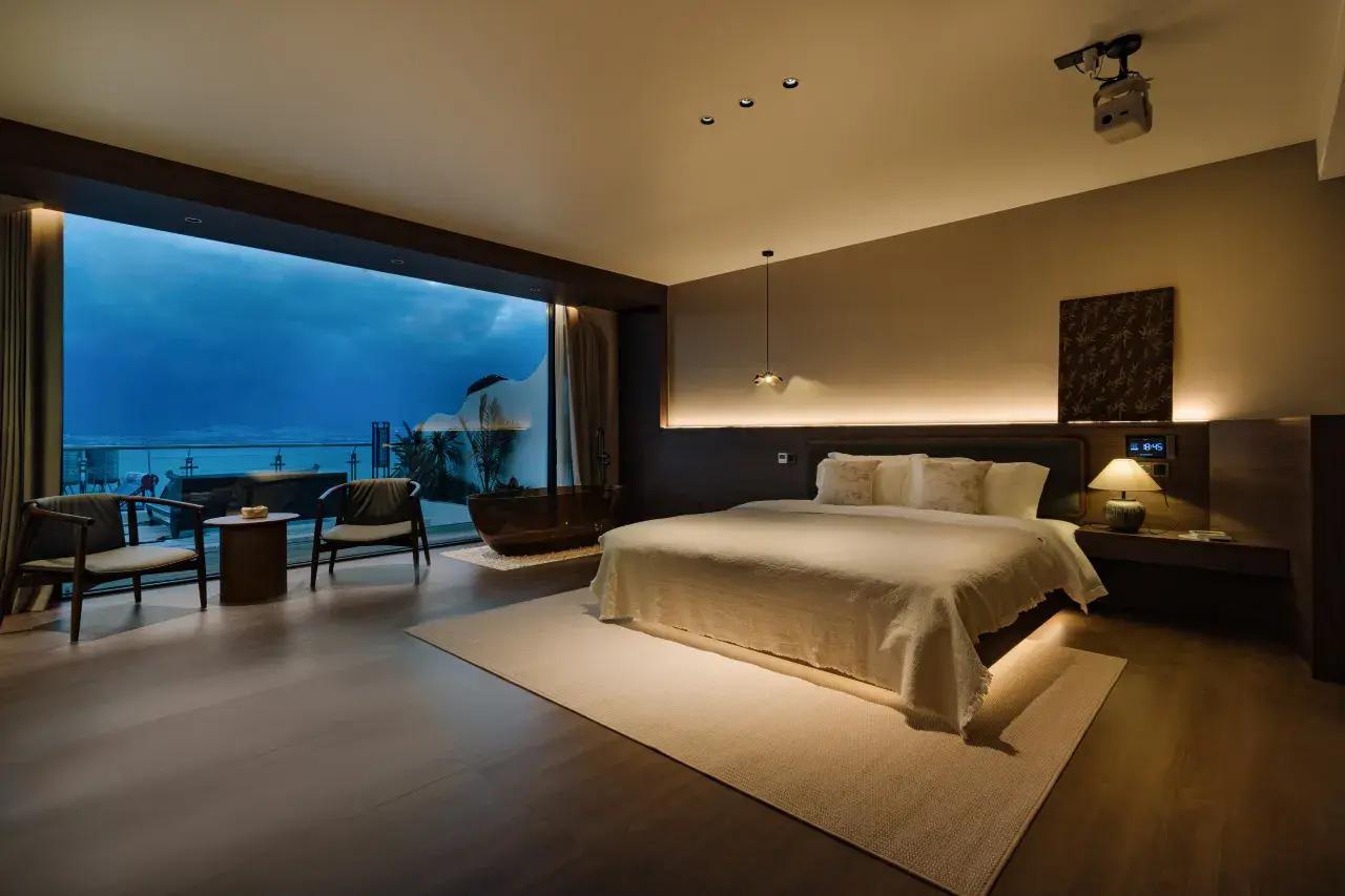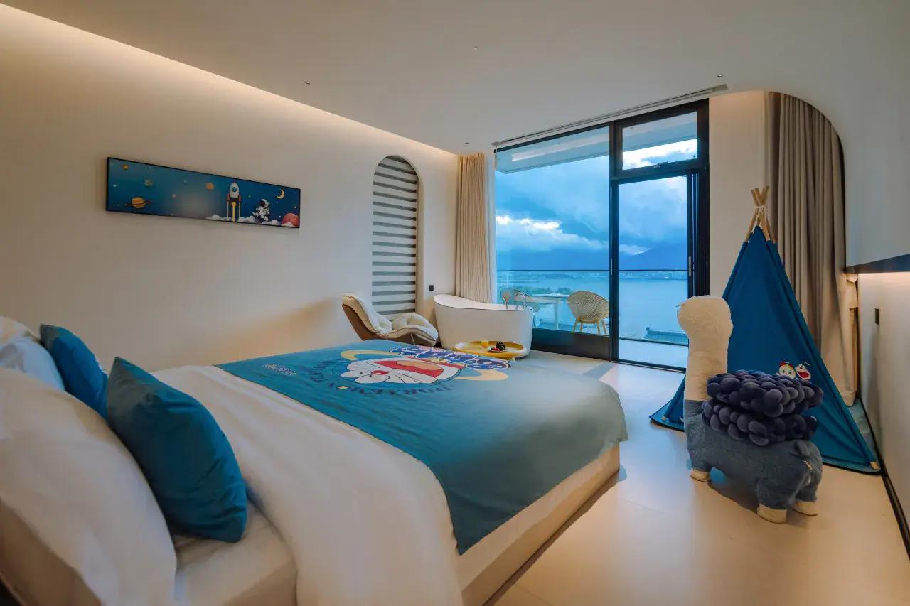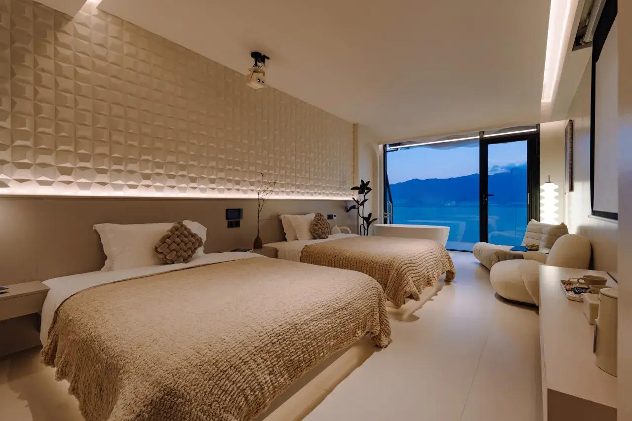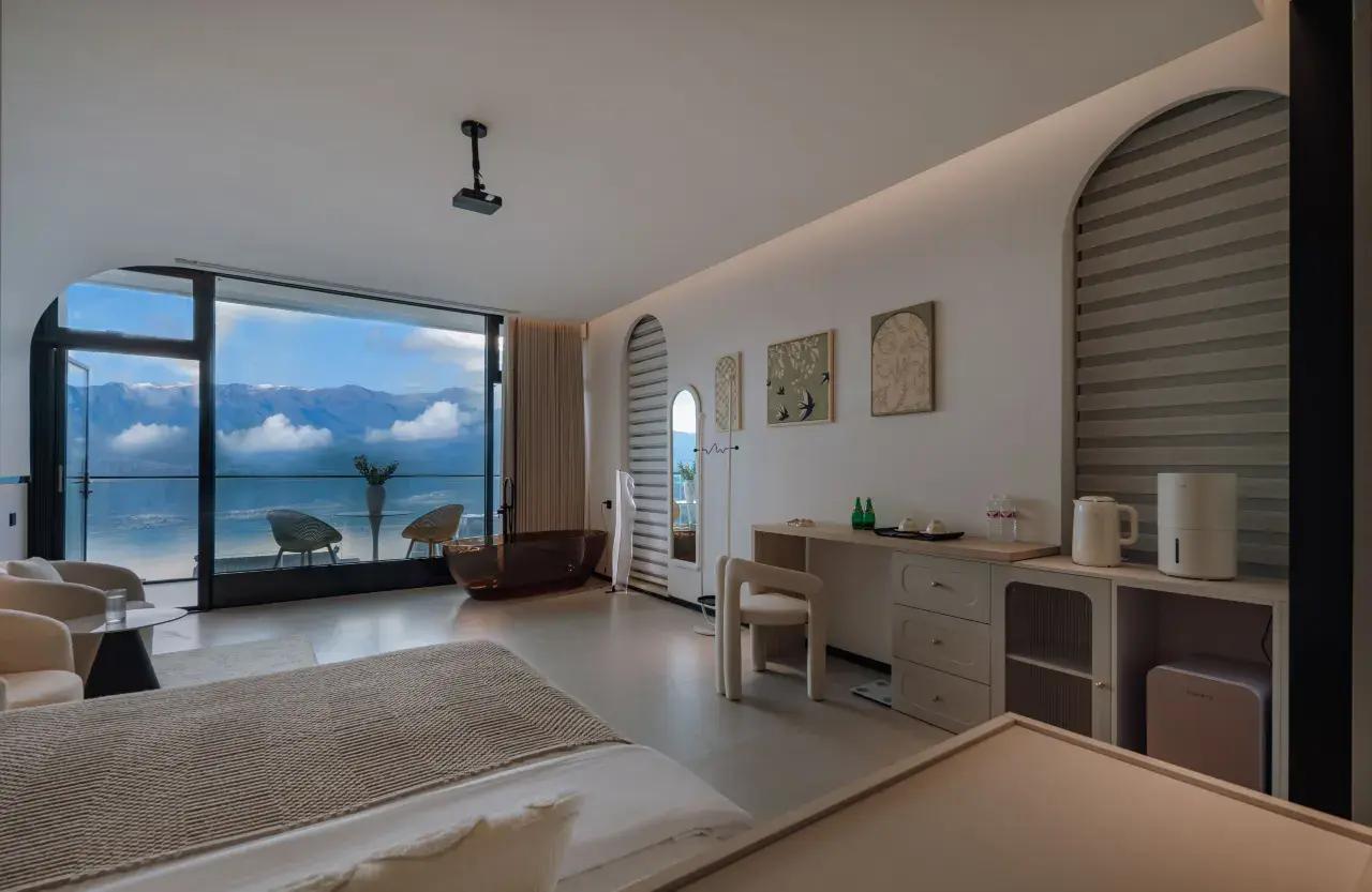 【独特设计理念】——秉持着对美学与功能性的深度理解,以纯净无暇的白色为主调,犹如云朵般轻盈,又如白鸽羽翼般圣洁,给人带来一种清新脱俗、宁静致远的感觉。这种大面积的白色运用不仅巧妙地放大了空间感,更营造出一种明亮通透、宽敞舒适的居住氛围。然而,看似单一的白色世界并非乏味无趣,而是蕴藏着丰富的层次与变化。设计师独具匠心地引入了深邃沉稳的黑色作为点缀,如同夜空中闪烁的星辰,或是墨色画卷上的灵动笔触,瞬间赋予了整个空间以深度与质感。黑与白的碰撞,既对立又和谐,简约而不简单,恰到好处地展现出一种现代美学理念。客房类型丰富多样,无论是浪漫温馨的大床房,还是充满童趣的哆啦A梦亲子房,抑或是拥有270°欧式拱门观景视角的苍山洱海景套房,均巧妙地将室内空间与户外景色无缝衔接。面积从56㎡至套房的188㎡不等,确保每位住客都能享受到宽敞舒适的居住环境。