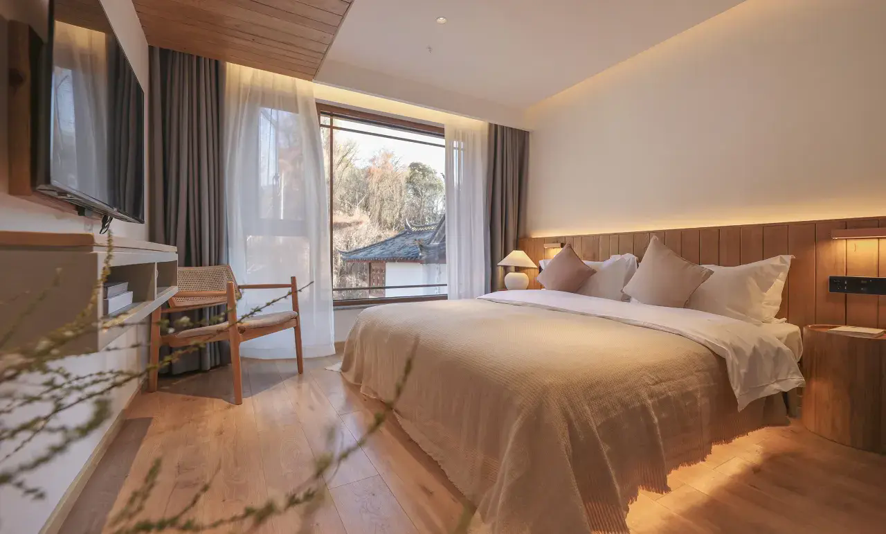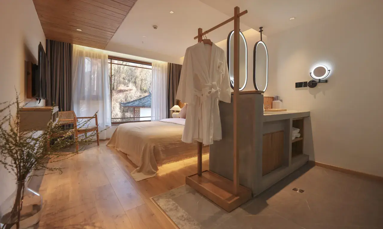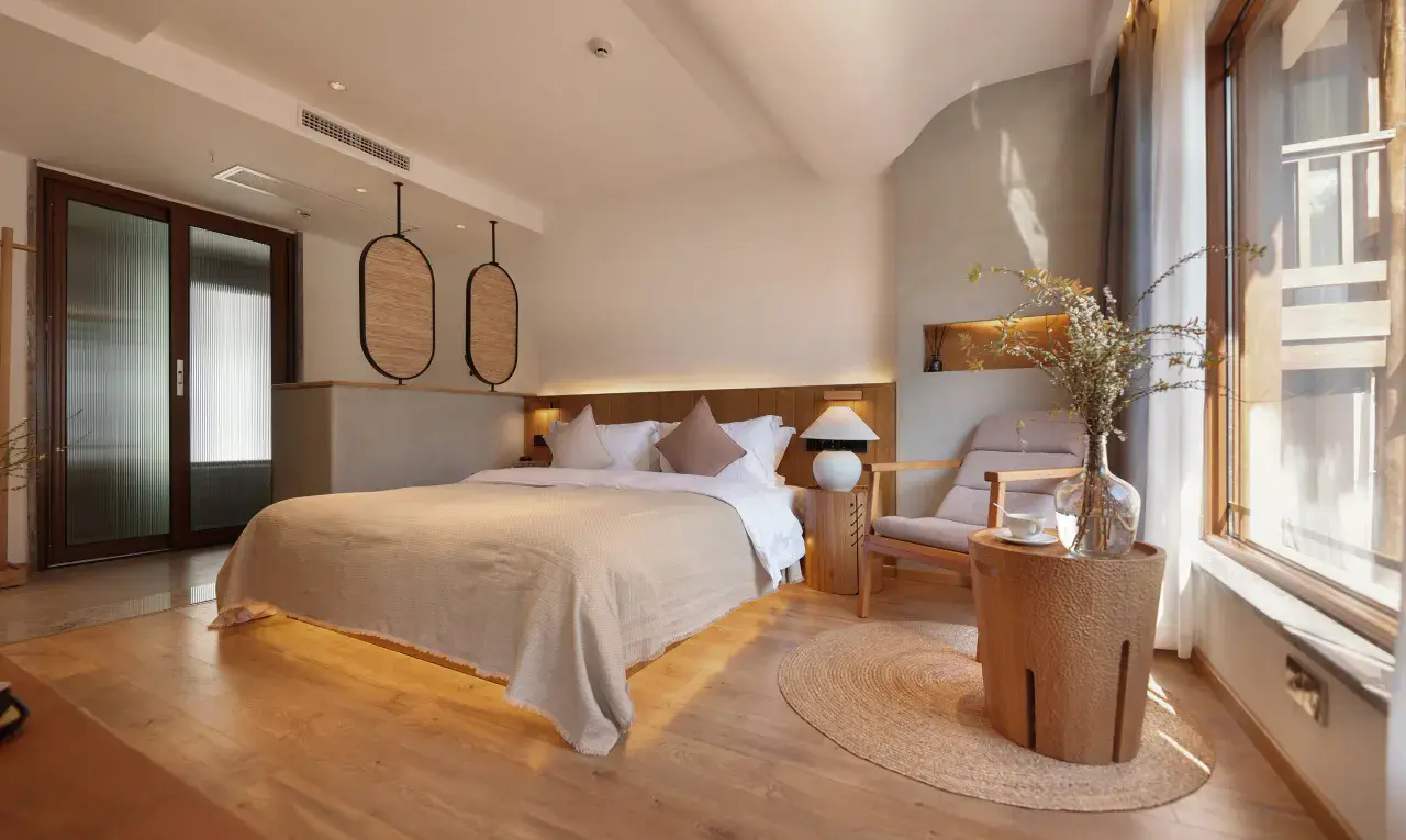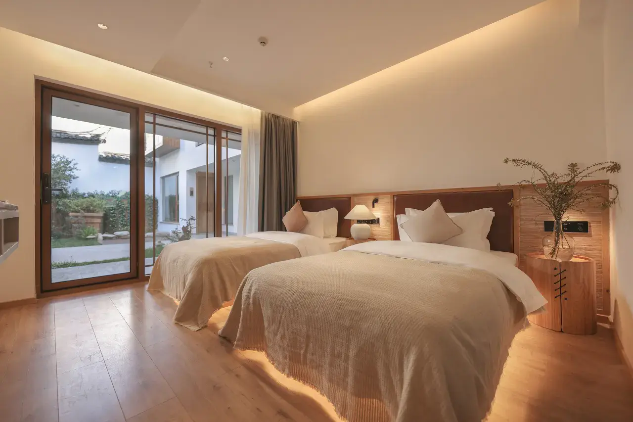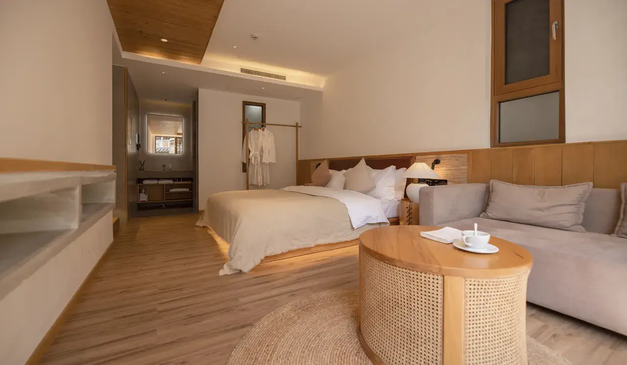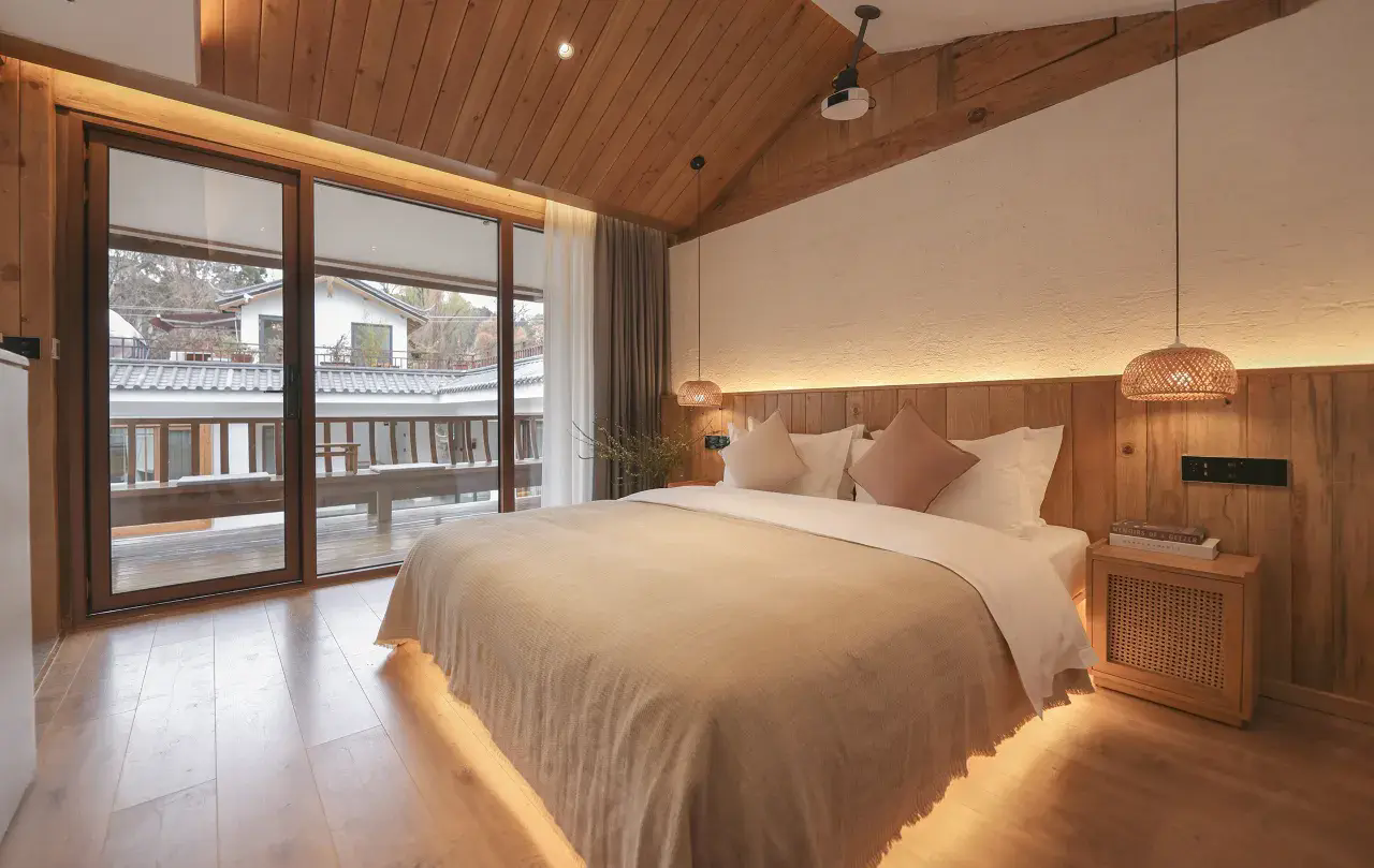 整套客栈风格以丽江自然风元素为背景,设立15间客房,包含大床房,双人间,家庭双床房,家庭套房四种房型。房间简洁干净采光好,不吵闹,全天时热水供应,每间房独立空调,客栈设有洗衣房,晾晒区,停车位。全智能清新脱俗的入住体验。