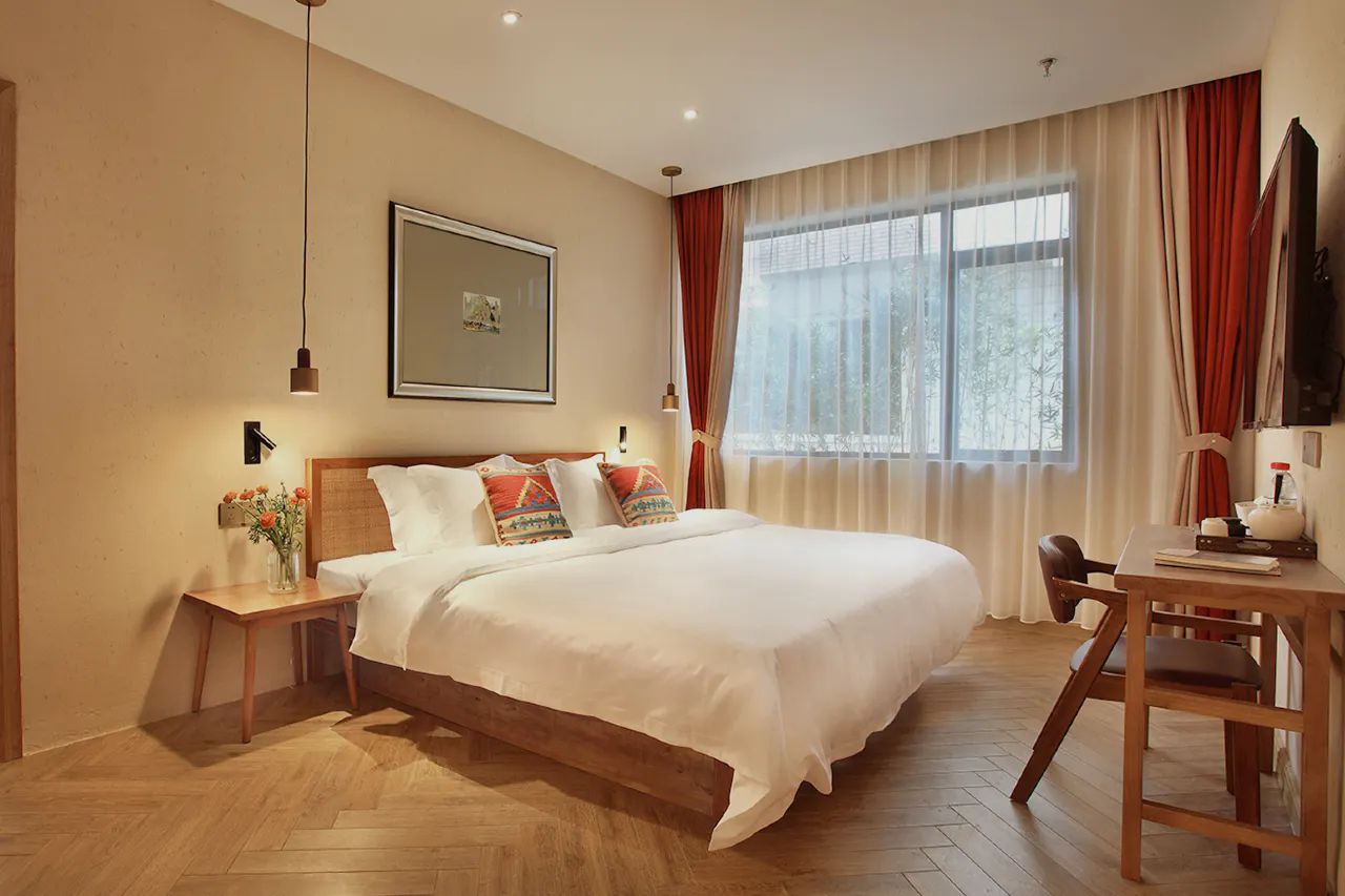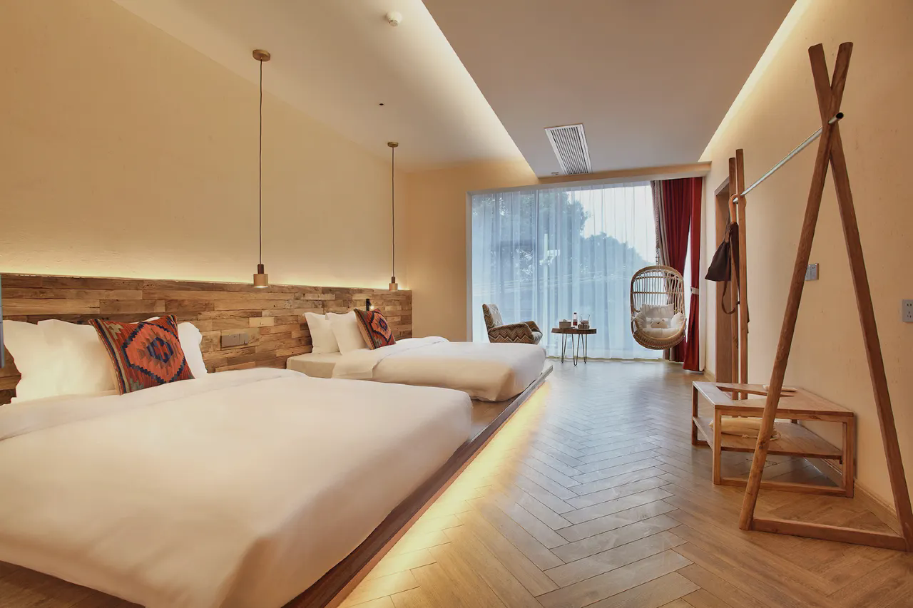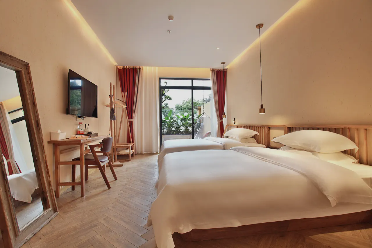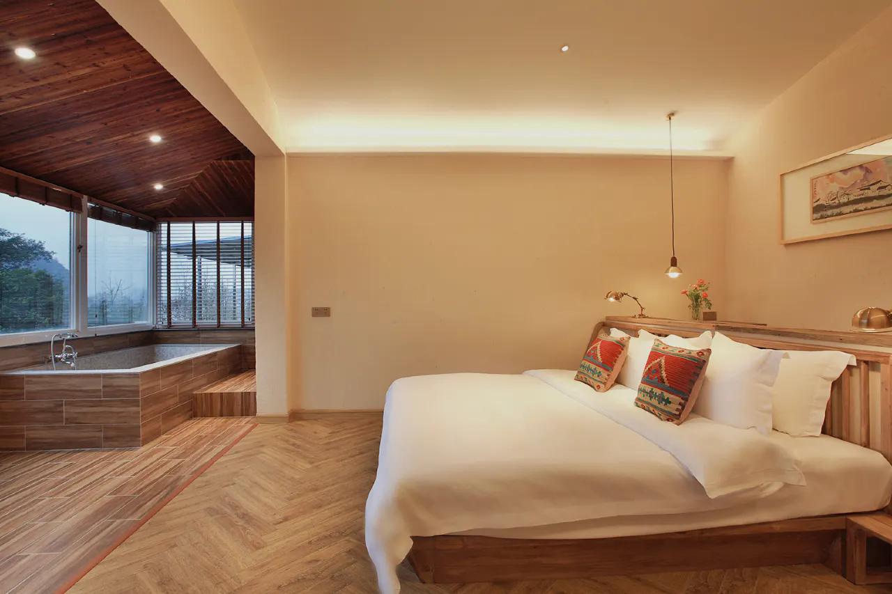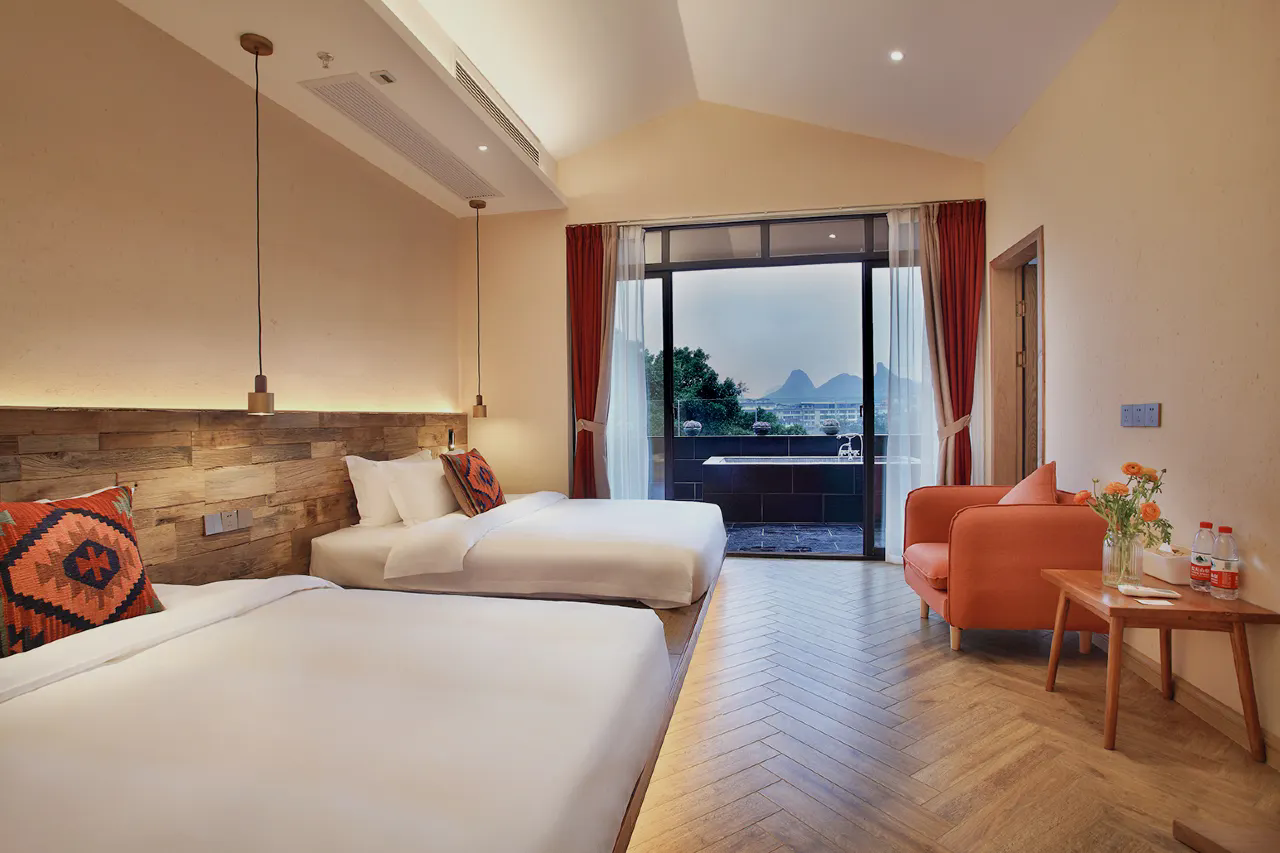 桂林玖米宿江酒店位于桂林市区漓江畔,距漓江约九米咫尺,名“玖米”,曰“宿江”。这里提供完善的餐食及住宿服务,为您准备了加宽的富安娜床垫与埃及棉裸睡级床品,加厚靠枕与泰国进口乳胶枕满足您的睡眠习惯。当您躺床上,透过落地窗,手工泳池映照山峦起伏中的叠彩山与独秀峰格外挺立。生态稻草涂料,无油漆原木家具,德国科勒智能马桶,汉斯格雅沐浴系统,提供高星级体验;或您还可以,坐在咖啡厅的炭火壁炉旁,一杯热饮两三好友,手中的的咖啡与屋顶的老樟木带来的古香雅韵,足以安抚喧嚣;而专场定制的party,电影小场也不会让你觉得没有情调。山水城的喧嚣中,漓江玖米的友人之家,随时恭候您回来。