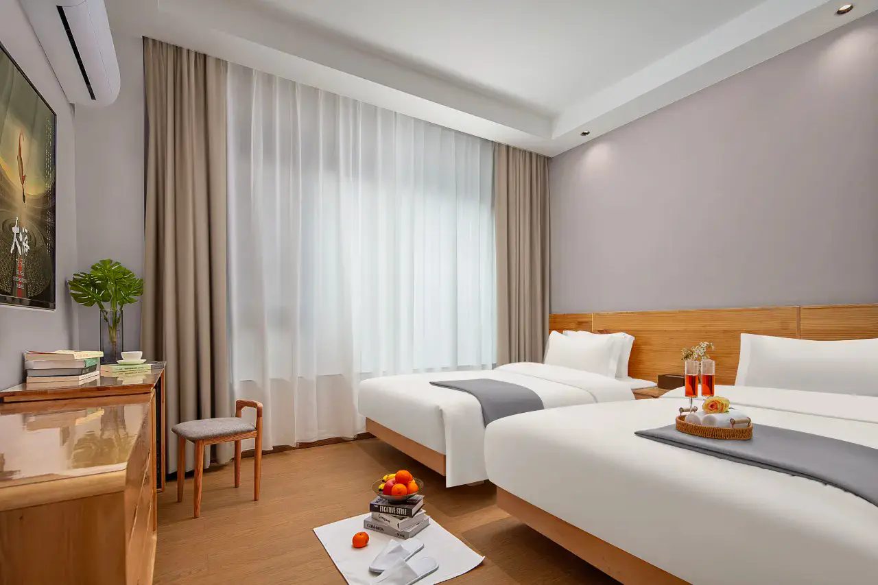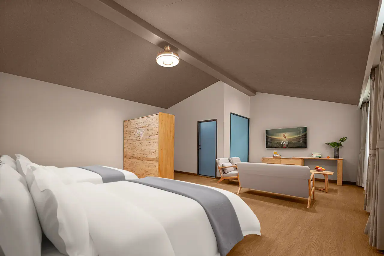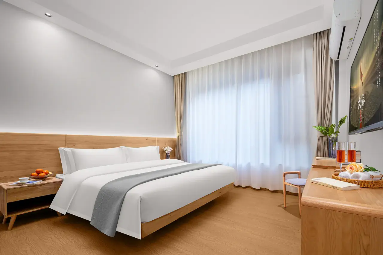 【住宿环境】酒店室内装修巧妙地将古老神秘的藏式风情与现代智能科技相融合,为每一位来到九寨沟的旅人,提供一段简约而不失精致的难忘旅居时光,水泥的灰、墙的白,融合着橘色与灯光的暖调,营造出安静活泼的氛围;房间整洁明亮优质的床品和家具家电一应俱全。【设施配置】藏式建筑的独特美感便扑面而来。藏式雕花窗棂与厚重木门上的精美纹饰,彰显着藏族工匠的精湛技艺,每一处细节都承载着浓郁的民族文化底蕴。走进房间,智能马桶的自动感应与贴心功能,让日常使用充满仪式感;空调随时为您营造出四季如春的舒适氛围;24 小时不间断的热水,无论是清晨洗漱,还是游玩归来后享受一场放松身心的热水浴,都能随心如愿。房间整体以简约的设计风格为主,原木家具搭配柔软的藏式布艺,既保留了自然的质朴,又不失精致的格调。