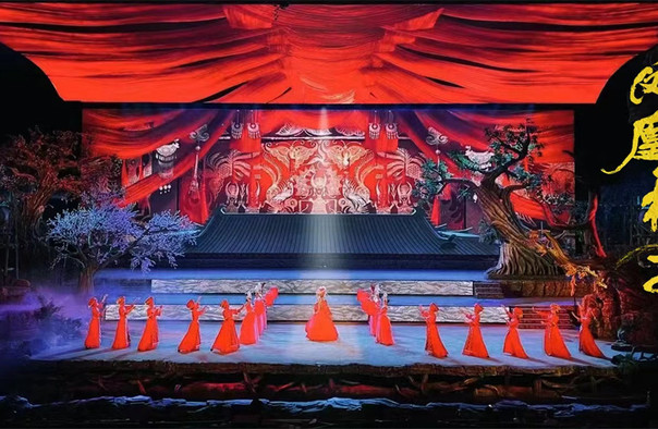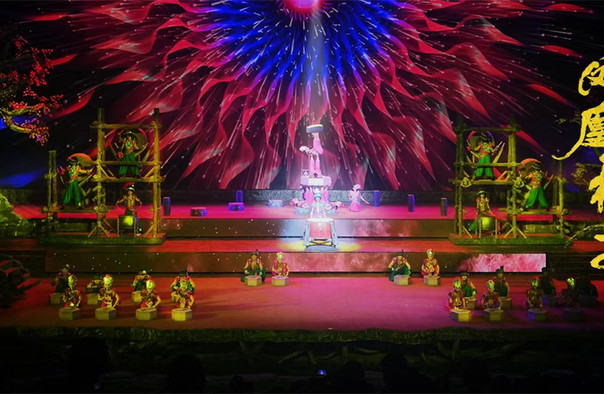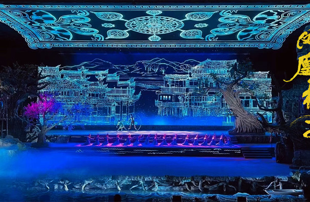 "《凤凰样子》大型传统实景篝火晚会"是一场在凤凰古城举行的露天夜场剧。