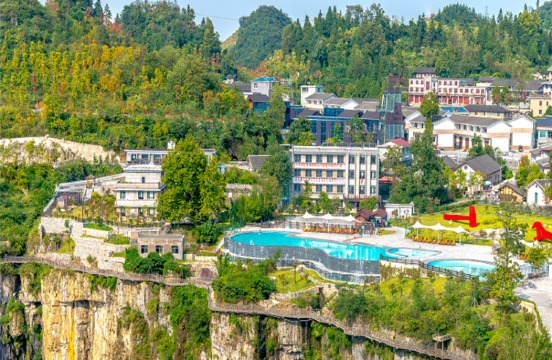 高空滑索,横卧于峡谷之间,全长357米,垂直高度有200多米,体验过程中游客将在空中“飞翔”,一览峡谷风光、鸟瞰朱砂古镇全景和悬崖泳池,一种欣喜和恐惧之感瞬间袭来。