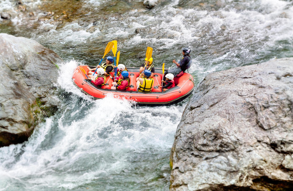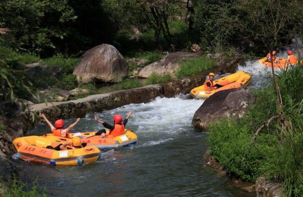 这里原始峡谷中的漂流是游人挑战自我的一项运动,首尾总落差近298米,拥有s型回旋弯道,分上下两段水道。这里中段水道长,相对平缓;上、下两段水道,落差相对集中,急转曲折,起伏跌荡。漂流全程急流与水潭相缀,互为映照,互为依接,陡的地方逼仄,缓的地方从容,急缓有致,起落有度。漂流途中从这些大大小小的石块缝中穿过,流水哗哗响,还有不少小瀑冲下,溅起的水珠的阳光下发出颤动的亮光。