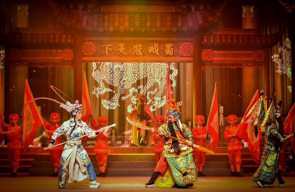 战火纷飞,三国争雄;川剧点将台,诸葛八阵图。川剧大靠武生会阵表演,翎子功技巧展示。