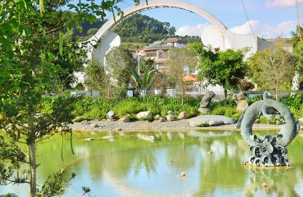 水池的中央有两个各重达16 吨的大理石球,代表了太阳和月亮,每逢甲子年,由于太阳、月亮、地球的公转和自传到同一条线上,这时候在墨江就会出现太阳还没有落山,月亮便开始升起,在日光和月光的照射下,这两个大理石球便会产生两个不同方向的投影并且交织在一起,因此形成了“日月交辉”的景观。