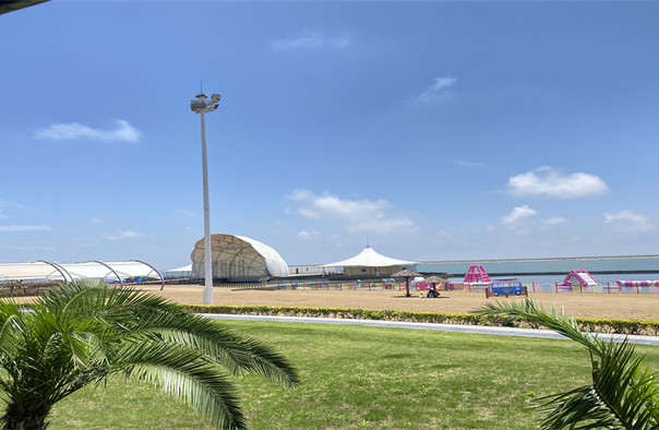 景区总面积2.81平方公里,其中1.3平方公里是沙滩区,包括30米宽的一片海边树林、50米宽的金色沙滩。在区域划分上东部为约0.5平方公里的海水沉淀区;中部为0.8平方公里海滨泳场,游泳区域约有1.8万平方米,能够同时容纳1万人游泳戏水;西区为1.5平方公里的水上项目区,主要用于帆板帆船、皮筏艇、尾波冲浪等水上项目。景区日容纳客流量可达致4.3万人,瞬时客流量为1.8万人。