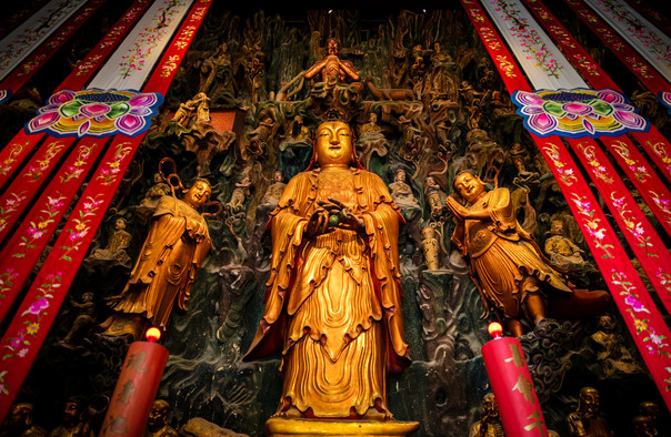 上海玉佛禅寺也称玉佛寺,地处繁华路段,是闹市中的一片净土。此寺始建于清光绪8年(1882年),与龙华寺、静安寺同为沪上名刹。现在的玉佛寺,分为前院和后院两大部分。前院即玉佛禅寺原来的寺址,中轴线上依次为大照壁、天 王殿、大雄宝殿、般若丈室(楼上为玉佛楼和藏经楼),为仿宋宫殿式建筑群;后院是一座多功能的觉群大楼。 寺内有文物室,藏有北魏、唐、宋、元、明、清历代珍贵文物。玉佛寺较出名的是清末普陀山慧根法师从缅甸请回的两尊玉佛,其实慧根法师一共请回5尊大小不一的玉佛,在返回普陀山的路上把其中的两尊留在了上海。一尊在玉佛楼内,是高1.92米的释迦牟尼坐佛像,佛身上装贴的金箔和镶嵌的宝石光彩夺目,为“镇寺之宝”。在玉佛楼的天花板顶,还塑有镏金佛像500尊,进玉佛楼参观需要另付10元门票。另一尊在寺庙西侧的卧佛堂内,是长96厘米的释迦牟尼卧佛像,按照释迦牟尼80岁圆寂时的摸样打造,侧身而卧,右手支头,神态安详。卧佛的对面,近代由新加坡信徒捐赠,新增了一座长约4米的玉制卧佛。此外,值得一看的还有在般若丈室前面和东西回廊墙壁、大雄宝殿两侧外围墙壁上,分别镶嵌的明华亭董其昌楷书《四十二章经》和行书《释迦如来成道记》墨刻、唐宋元明清名画家绘观音菩萨三十二应身宝像刻石、释迦牟尼八相成道记画像石刻、唐贯休绘十六罗汉像石刻。玉佛寺香火旺盛,每逢初一、十五香客不断。较出名的是大年初一烧香,有的香客大年三十晚上就在寺庙门口等候,盼望烧到香,许下的愿望能更灵验地实现。