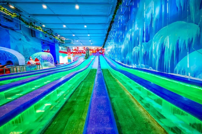 在这座“宝藏冰窖”内,绚丽的冰川滑道、洁白的雪海滑道