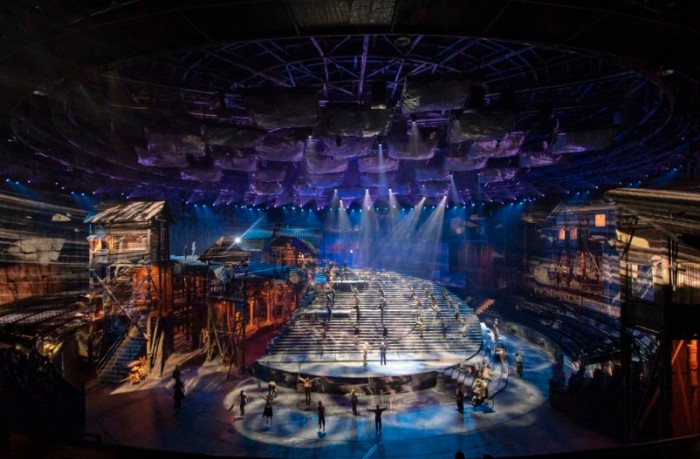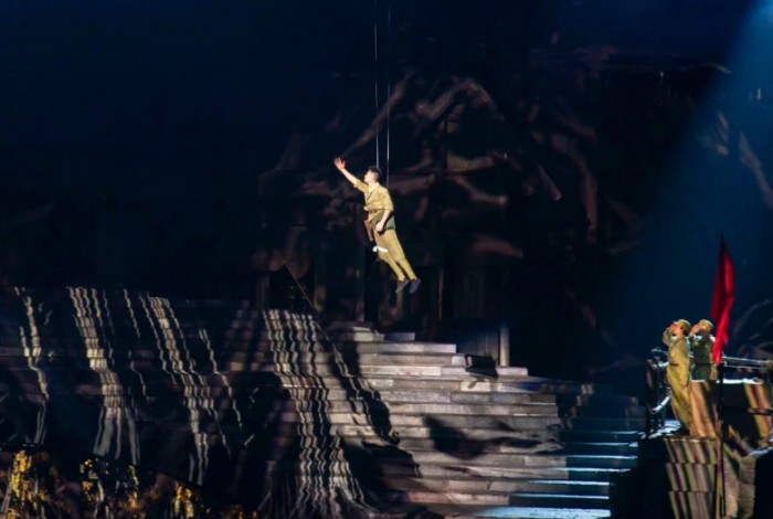 演出采用多维立体沉浸式体验,观众席与表演区同步旋转,配合震撼的爆破特效、倾盆大雨和飞机轰鸣声,打造出超越VR的沉浸式体验,仿佛瞬间穿越回 1949 年的重庆街头。激昂的枪声、催人泪下的诀别、振奋人心的曙光……每一幕都直击心灵,让你在光影变幻间,读懂重庆这座 “英雄之城” 的精神内核。