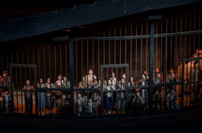 再现了渣滓洞里的不屈抗争。革命志士们在牢笼中绣制红旗,一针一线缝制着对新中国的期盼。"11·27大屠杀"场景里,血色光影中烈士们高呼"新中国万岁"的呐喊,让整个剧场为之震撼。