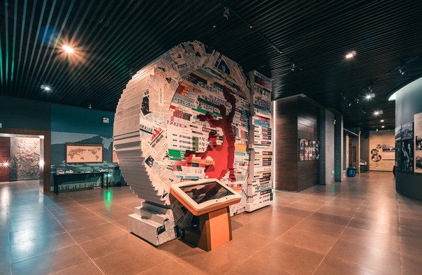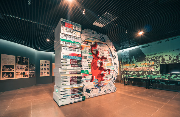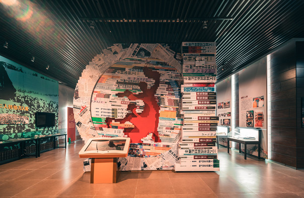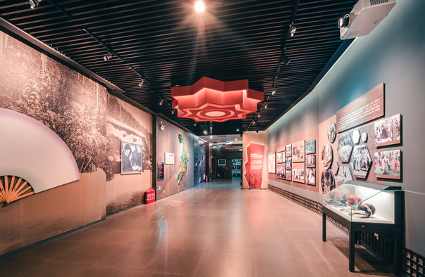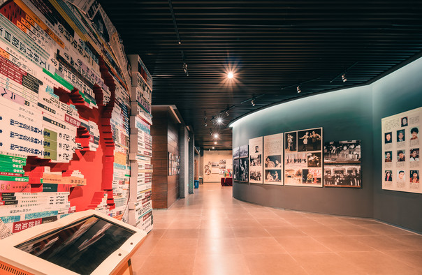 进大门映入眼帘的是手绢造型的景观墙,立体的东北二人转分布地图,以及播放着二人转纪录片的大屏幕。展区第一部分,以图文、手稿和文物展示二人转的艺术起源与发展流布,展柜中陈列着多种二人转早期的服装、头饰以及大板、花棍、沙拉鸡等手持道具。向里面走,是唱大车店、唱木帮房两个二人转场景的复原,还在展柜中陈列了拜师仪式等微缩景观。