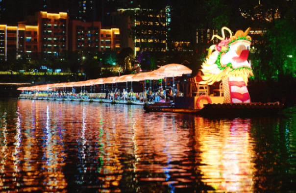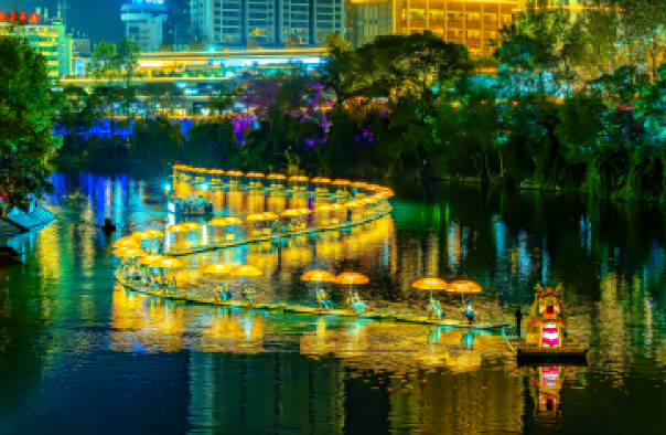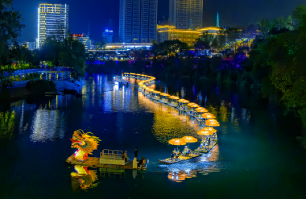 “铜仁浪漫,龙游锦江”项目就坐落充满魅力的中南门古城附近。该项目由贵州元璞旅游有限公司倾情打造,以中南门古城、锦江河为轴心,围绕“景城一体,主客共享”的理念,集水上竹筏游船、民俗歌舞表演、沉浸式剧情演绎为一体,打造了一个丰富的综合类夜游体验,是一场融合历史文化与现代休闲体验的特色之旅。