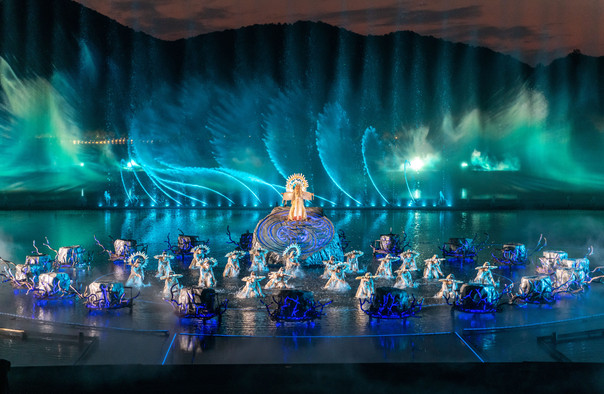 在湘湖的青山绿水间,通过数字化演绎、科技化呈现和现代化表达,借助可升降倾斜的水上机械舞台、喷泉、移动影像载体、无人机编队表演以及“钱江潮涌”亚运主火炬塔,融合多元演艺形式,使越之风韵、宋之美学、国之文化得到淋漓尽致的展现,从而打造一台融合实景山水、创新科技和人文风采的演艺大秀,继续讲述湘湖故事、杭州故事、中国故事。