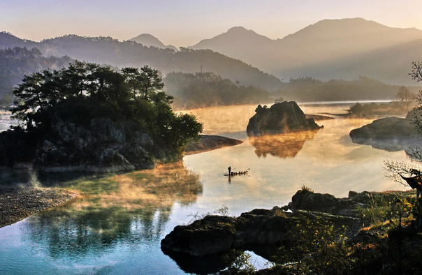 楠溪江中两座小屿,一如狮一似球,名“狮子球屿”。从楠溪江畔走过,远远便可望见一头雄狮在粼粼清波中戏球。狮子岩周围河滩开阔,每当旭日东升朝霞万朵,便能在碧潭中倒映出绰绰的影姿;待至皓月当空凉风习习,一排排竹筏从水上悠悠荡来,万籁俱寂,有那时而钻入水中时而又跳上竹筏的鸬鹚偶尔打破如水的平静。