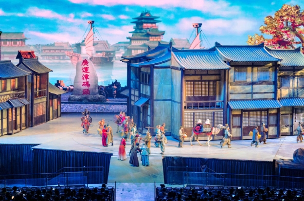 不同于其他的演艺是固定的座位,单一的舞台,这里的观众席是可以旋转行走的。看完一幕,观众席就会旋转,直到七幕剧演完,观众席恰好旋转360度。