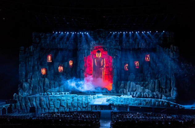西安华夏文旅大剧院作为华夏文旅西安度假区项目的标志性建筑,剧场设计为一座长142米,宽128米,高约50米的大型椭球体建筑物,可容纳3000人同时观看演出。剧场中央巧妙设计并修建一座可移动观众席,打破了世界单一舞台演出模式,通过旋转行走看台将观众送至最佳观演位置,带给观众全新的视听享受。