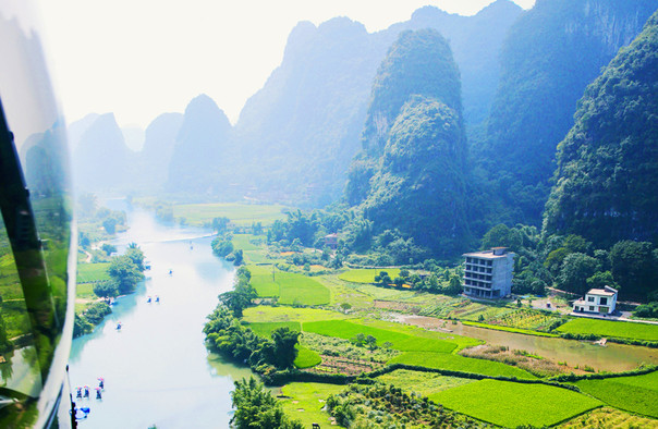 你尝试过从300米的空中鸟瞰阳朔遇龙河吗?直升机在空中或高旋或低俯,迎着气流扶摇直上,场景很是壮观。当直升机缓缓升起,盘旋在遇龙河沿线上空,俯瞰阳朔,青山绿水将显得更加精致。远处林林总总的群山,呈现出来的视觉效果就像是海市蜃楼。从仰望到翱翔,对天空产生了更多的想象空间。从空中更细致地欣赏阳朔的美,角度不同,带来的美的感觉也完全不一样。