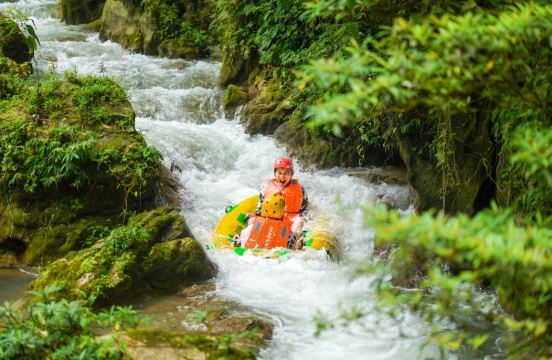 漂流的一路上会经过三个峡谷和三处溶洞,这种一明一暗的交替体验也被游客戏称为“三天三夜”漂流。峡谷和溶洞处的风光都美。在峡谷内有遍布的参天古树,一派经典的热带雨林风光,穿插在其中的几处落差超过100米的大瀑布更是壮观秀美,是拍照的好地方。而溶洞则规模宏大,内部有独特的钟乳石风光,景色奇幻,可以在船工的讲述下尽情发挥自己的想象力,感受大自然的鬼斧神工。