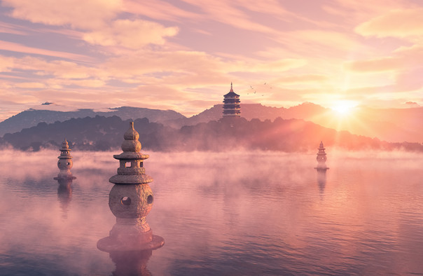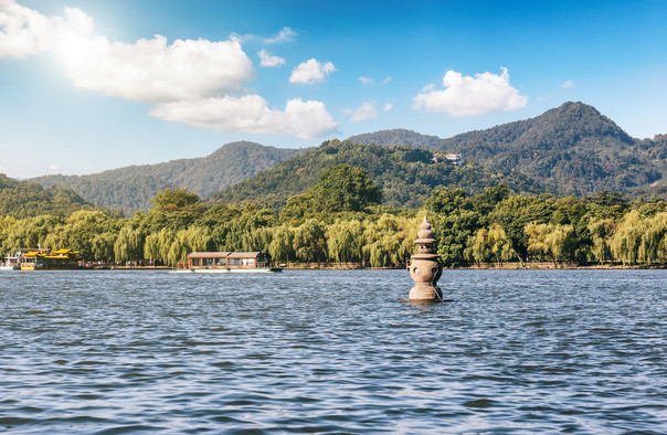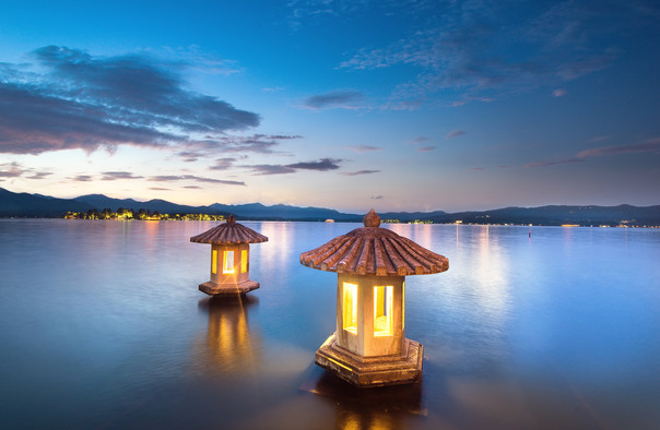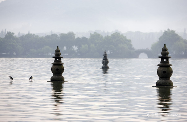 三潭印月又称“小瀛洲”,位于西湖中部偏南的湖面上,是西湖三岛中面积很大、仅有能上岛游览的一个。岛屿的轮廓像一个“田”字,外圈的环形上是优美的江南园林,内部被十字形的岛和桥分割成四个小湖,充满诗情画意。乘船登岛上岛必须乘坐西湖游船,沿着西湖有多个码头,其中花港、中山、杭饭(岳庙)码头的游船停在岛的西面,而湖滨(市区)上岛的游船则停在东面。上岛后游玩时间不限,游玩结束后可凭票回到以上任意一个码头,非常方便。岛上景观三潭印月并不大,岛上步行即可。岛上的人文景观集中在到的北端,先贤祠、开网亭、亭亭亭、九石狮、九曲桥等等,颇为精致。从北端上九曲桥,沿着中线往南走,便到了“三潭印月”御碑亭,这里算是整个岛的标志,很多游客在这儿合影留念。继续走到最南端,穿过我心相印亭,可以看见开阔的湖面上有三座石塔,这也是三潭印月的精华所在。以往每到月夜,尤其是中秋,人们在塔中点上蜡烛,在塔身四周的圆形小洞上蒙上薄纸,光线便透过纸印在湖面上,和天上的月亮交相辉映,美不胜收。这一景也被称作“三潭印月”,名列西湖十景之一。一元纸币的背景看到这三座石塔,你一定会感到似曾相识,因为这正是人民币一元纸币背后的图案。于是,每天都有很多游人在这里拍石塔和一元纸币的背景的合影。实际上,在岛上是找不到和人民币上一样的角度的。而且因为是远观,其实也看不清三塔身上的小孔。如果从花港码头出发,半路可见到石塔,如果想要靠近了看,可以在花港观鱼岸边租一条手划的小船,请船夫划到离石塔100米左右的地方,费用约150元/小时。
