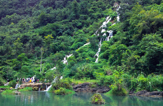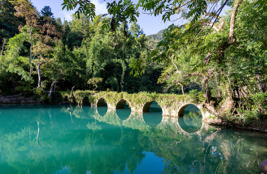 荔波小七孔景区位于荔波县城南部的群峰之中,景区响水河上横跨着一座青石砌成的七孔拱桥,故而得名。景区融山、水、林、洞、湖泊和瀑布为一体,秀美幽静,加上浓郁的土家和瑶族风情,使得小七孔景区声名大噪,是避暑胜地。