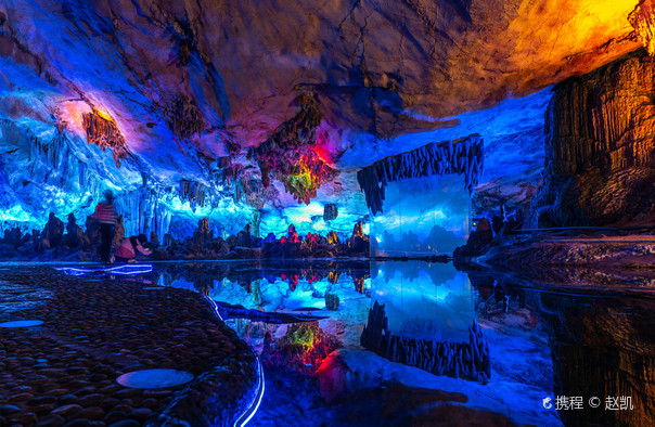 芦笛岩洞深240米,游程约500米,大约游玩40分钟左右。进洞后,在林立的石柱缝隙中间转来转去,加上彩色灯光的照耀,如同置身仙境一般。岩洞内有免费的中文导游讲解服务,讲解员讲得很仔细,每个景点都会停留,配合着讲解看会比较有感觉。但是,缺点在于讲完就直接走的,没有给游客回味的空间,并且彩灯开关就在讲解员身边,人走灯灭,所以,无法多做停留。如果是旺季,有多批客人同时入洞,不止一个导游,则没有这种情况,你完全可以蹭后面那批的导游。