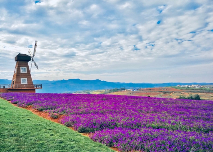 薰衣草主题公园:别称七彩花田,有薰衣草、燕尾草、风铃草、黄冠菊等10余种美丽的花卉,其中一大片薰衣草花海簇拥着景区(花期4月-10月),仿佛置身于异域欧洲,所以有着“滇中普罗旺斯”的美誉。