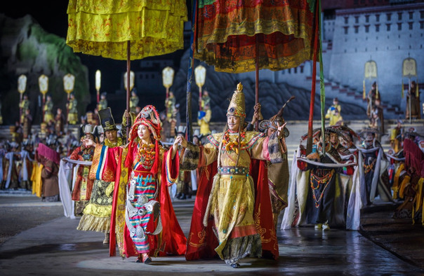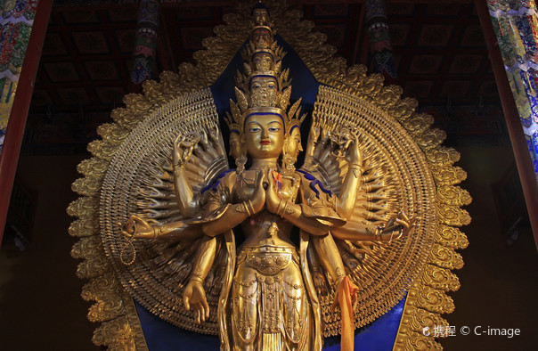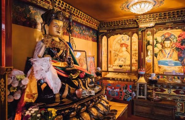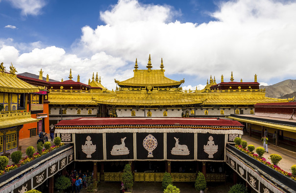 此外,寺内有长近千米的藏式壁画《文成公主进藏图》和《大昭寺修建图》,还有两幅明代刺绣的护法神唐卡,为难得的艺术珍品。转经道拉萨有“内、中、外”三条转经道,都是围绕着大昭寺为中心而进行。其中,沿寺内千佛殿绕觉康大殿一圈为内转,称“囊廓”;沿大昭寺外围一圈为中转,称“八廓”;围绕布达拉宫、药王山、小昭寺和大昭寺一圈为外传,称“林廓”。景点导览沿正门进入大昭寺后是一个天井式院落,院子东侧有数排酥油灯,因信徒每天都会添加酥油,故常年不灭。酥油灯后面既是大昭寺主殿正门,门口左侧为红教创始人莲花生大师,右侧为强巴佛,即弥勒佛,也称:未来佛。右侧墙上是关于大昭寺建寺故事的壁画,主要内容是7世纪时期布达拉宫的样子,以及当年填湖建大昭寺的情景。按照顺时针的顺序过去是供奉黄教祖师宗喀巴大师及其八大弟子的佛殿。继续右绕前行,穿过两边的夜叉殿和龙王殿,数百盏酥油供灯后面便是著名的"觉康"殿。它既是大昭寺的主体,也是大昭寺的精髓之所在。觉康殿中央为大经堂,是平日里喇嘛们念经修行的地方,四周有很多小经堂,其中不可错过的既是位于正中的释迦牟尼佛堂,供奉着文成公主带来的释迦牟尼十二岁等身金像,这里是大昭寺的中心,也是前往此地的虔诚朝拜者向往的圣地。庭院旁有楼梯通往二楼和三楼,二楼有供奉藏王松赞干布、文成公主、尺尊公主的法王殿和供奉吉祥天母的班丹拉姆护法神殿。站在二楼宽阔的露台上,可远眺布达拉宫,是拍照的绝好位置。三楼的金顶也是大昭寺的看点之一,只不过三楼绝大多数时候不对外开放,万一机缘巧合可以登上三楼,四座金碧辉煌的金顶让人叹为观止。
