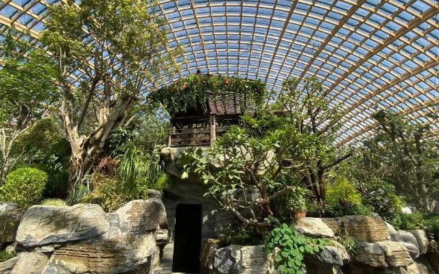 “露珠”温室:作为园区亮点,总面积达到1.3万余平方米的三座展览温室宛如三颗“露珠”镶嵌在景观湖边,这是整个植物园的核心,由热带雨林馆、沙生植物馆、珍稀植物和四季花卉植物馆组成。