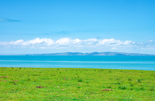 广场走到湖边处,可以看到蔚蓝浩瀚的青海湖就在眼前,沿湖修建了木制栈道,栈道东侧有福娃、西王母的雕像,湖中是一座鱼雷基地的遗址,这里曾是建国后151鱼雷基地的所在地,所以二郎剑景区也被称为151景区。