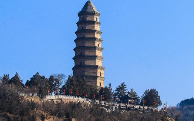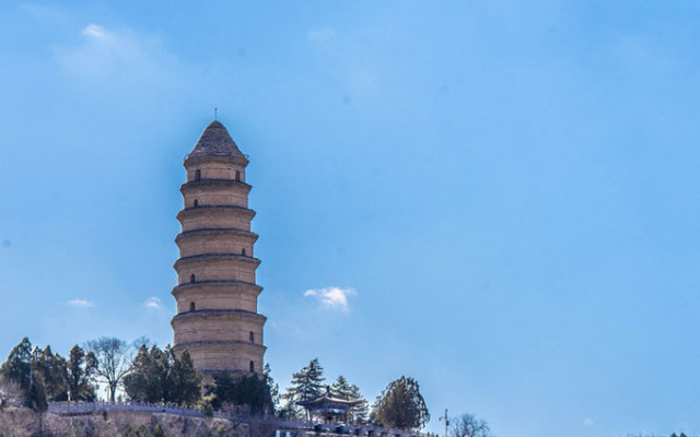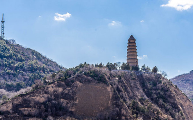 宝塔山,位于延安城东南,延河之滨。在山上可鸟瞰延安整个城区。山上宝塔,始建于唐,现为明代建筑。九层,平面八角形,高约44米,楼阁式砖塔,中共中央进驻延安后,这座古塔成为革命圣地的标志和象征。它是历史名城延安的标志,是革命圣地的象征,是延安市的标志性建筑,是游览延安的必去之地,国家AAAAA级景区。