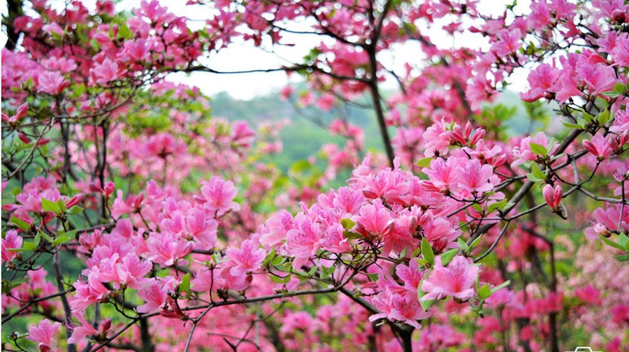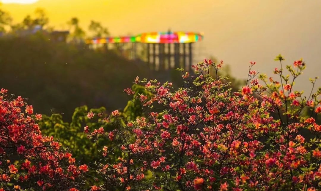 天马寨位于湖北英山境内,古为蕲黄四十八寨之一,四月是天马寨美丽的季节,五彩杜鹃沿着高海拔接近1100米的高度梯次盛开。尤其是进入下旬,盛开的杜鹃开遍整个山脉的大小山脊,让荡漾翠绿的群山披上绵延十里的“五彩丝带”,蔚为壮观。也让这座默默无名的大山一时间人满为患。天马寨与其它景区的杜鹃群落不同,杜鹃花海虽然还是以红色为主打,但是紫色杜鹃的稀有绽放,更具特色。走进花海中,不得不被这里杜鹃的魅力所震撼,杜鹃恣意盛开,有的依附于杂乱的怪石之间,有的红紫相间,有的与一些灿烂的野花作伴,它们扎堆成片,顽强的枝干或疏斜,或丛生,棵与棵相互扶持,枝与枝彼此并肩,朵与朵挨着笑脸,绽放着各自的灿烂,连在一起,宛若仙境,独树一帜,美艳称绝。人在花间走,如在花海游。淡淡的花香涤荡着心神,让人如痴如醉。从山腰一直开到山顶,深红、粉红、深紫、灰紫、鹅黄,淡白,色彩斑斓,璀灿成趣,烂漫整座大山。像一幅神妙的山水画卷令人眼花缭乱,又似一匹匹状如簇拥奔腾的骏马,身披五彩朝霞奔腾簇拥心灵的温暖。绵延不绝的花朵将游人的脚步向上拉扯,美在自然。