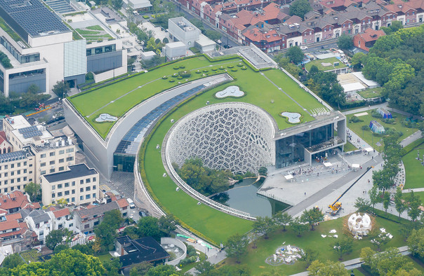 上海自然博物馆位于静安雕塑公园,场馆宛如一只“绿螺”,外观独特。如今的新馆内展出了上万件标本藏品,内容丰富,尤其以一副体长约26米的中加马门溪龙的骨架甚是抢眼。