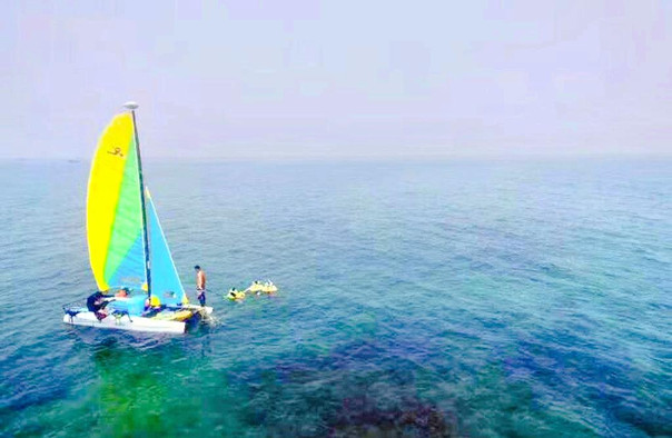 涠洲岛是火山喷发堆凝而成的岛屿,有海蚀、海积及溶岩等景观,有“蓬莱岛”之称,这里蓝天、白云、岩石、巨浪交相辉映,美不胜收。涠洲岛风情水上俱乐部游玩路线主要是坐帆船乘风破浪出海航行,在岛上景点之一的蓝桥附近浮潜,在教练指导下玩冲浪板。浮潜所需装备都有提供。在专业人士的指导下,带你从另外一个角度看到不一样的涠洲岛。
