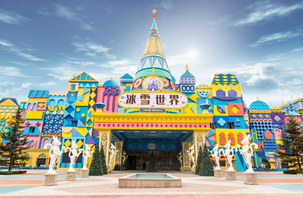 银基冰雪世界,醒目的色彩、多样的几何图形,梦幻又具有神秘气息,远远望去,银基冰雪世界,像降落人间的童话城堡。