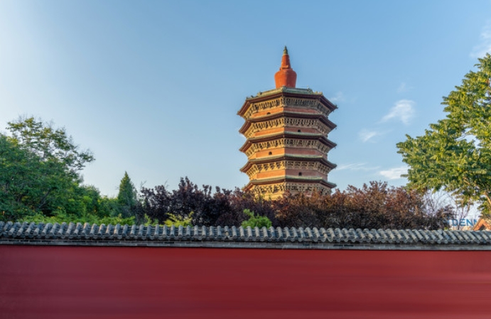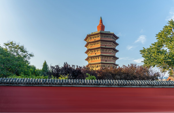 该塔高38米,塔身呈八角形,共五层。全部为砖结构,在暗红色的塔砖上雕有图案,内容以佛教故事为主。塔顶有一座小小的宝瓶状塔刹,塔刹形状与北京北海的白塔十分类似。登塔可以眺望到古城的远山近水。