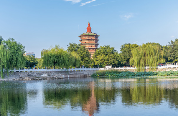 文峰塔位于安阳市古城内西北隅,高 38.65米,周长40米,因塔建于天宁寺内,原名天宁寺塔;又因位于旧彰德府文庙东北方,作为代表当地“文风”的象征,故又称文峰塔。文峰塔建于五代后周广顺二年,距今已有一千余年的历史。虽经历了战争年代的炮火考验,至今依然屹立,巍峨壮观。文峰塔的建筑,富有独特的风格,具有上大下小的特点。由下往上一层大于一层,逐渐宽敞,是伞状形式,为国内外所罕见。
