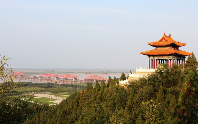登高北望,黄河水无际无涯,浩浩荡荡。黄河在这里阔泻出山,平注中原,附近的桃花峪就是黄河中下游的地理分界线,山下河面可达七八里宽,居山巅而瞰大河,上游河床狭窄深邃,如丝如线;下游河床阔沙浩渺,浊浪深沉。其雄浑的气势,壮观的激流,让人不仅联想到唐代大诗人李白的名句:黄河之水天上来,奔流到海不复回。
