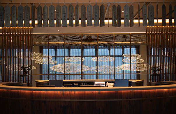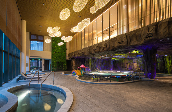 室内泡池区采用了与自然结合的设计理念,让温泉体验感更加独特,就像回归到自然秘境之中。挑高区运用当地竹子元素布满天花,搭配云朵造型艺术灯具、墙面通高绿植墙,整体自然质朴,更像一个世外桃源中的秘境浴场。