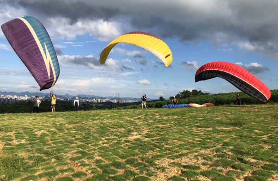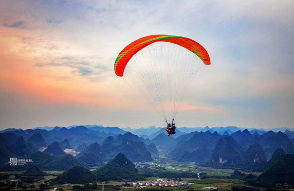 螺蛳粉小镇飞行营地坐落在百乐竹海山顶,稳定的气流,开阔的视野,特别适合初学者飞行体验。基地连绵喀斯特山脉,风景独特秀丽,全年可飞天数达280天。