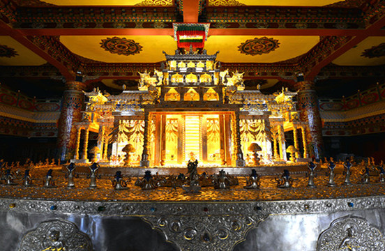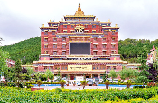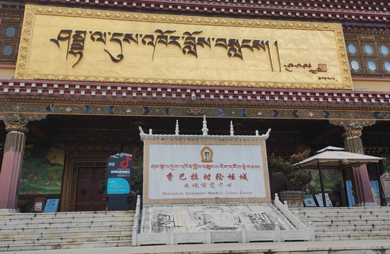 香巴拉时轮坛城文化博览中心坐落于香格里拉坛城广场正中,外观雄伟、气势磅礴。它按照天圆地方的理念设计,有着藏传佛教的内涵和民族文化的渗透。大楼高60.4米,有11层,顶部是白塔式的金顶,是我州目前层数多、高的藏式地标性建筑,装饰画采用天然的矿物颜料和自然涂料。是一座内外协调、规模宏大的藏式建筑群。目前开放藏地瑰宝、多彩香巴拉、雪域印象、香格里拉等展馆,分别从自然风光到人文生活、历史溯源到宗教艺术,以不同的视角展现多样的藏族文化。