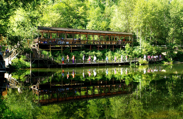 柴河小九寨(北国小九寨)风景区,位于长白山余脉张广财岭东麓的宏声林场,是全国大的森林公园——威虎山国家森林公园的核心景区。这里的原始森林红松成片,苍天古树高大挺拔,走在林中可享受古朴清幽、花气芳香,其秀丽的风光与原生态的自然环境,都可让你感受到九寨沟般的韵味。景区内山峰秀丽,随处可见到奇松怪石,还有两条清澈的高山河流——金溪谷和银溪谷,终年流水不息,由于落差较大、多处跌水,而形成东北地区罕见而壮观的九叠泉瀑布群。此外,惊险刺激的威虎山第一漂,足足有9公里,也十分值得尝试。灵山韵水之外,长篇小说《林海雪原》和现代京剧《智取威虎山》中的英雄杨子荣追歼残匪的故事也发生在这块土地上,革命故事广为流传。这里不仅可赏森林参天古木,也可观北国独特风光,亲身体验大森林的神秘和林海雪原的意境。