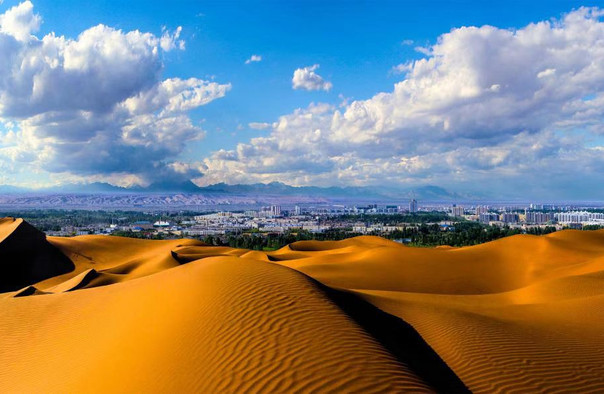 库木塔格沙漠位于新疆吐鲁番盘地的东缘,距离吐鲁番市区90公里。库木塔格是一座流动型沙漠,有众多的沙窝、沙山等,景色多样壮观,维吾尔语“库木塔格”也是“沙山”的意思。
