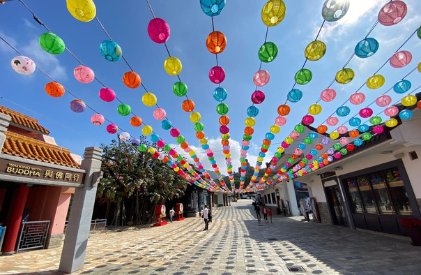 △ 位于香港大屿山的昂坪市集占地1.5公顷,毗邻昂坪缆车站、天坛大佛及宝莲禅寺,市集内富有中国文化特色的建筑及园林设计与昂坪独有的大自然景致互相融合。提供多姿多采的消闲、餐饮及购物体验,是来香港自由行的必到景点。