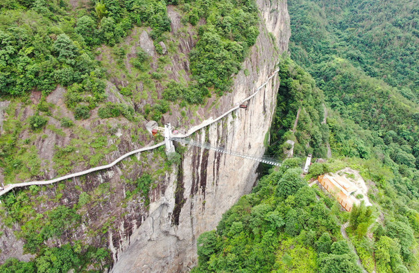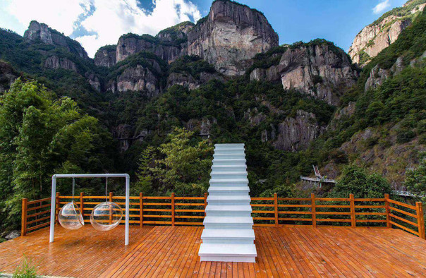 崖下库位于岩头镇西南,临近埭头古村,是大若岩景区的一部分。经过一番重修和扩建,这里很快成为小楠溪热门的景点之一。崖下库大的看点是深藏在陡峭悬崖中的含羞瀑,除了出彩的自然景观,这里受欢迎的原因还在于设施精良,能把人带入非常险峻的山崖和瀑布中,让你尽情近观楠溪山水之美之险。游览崖下库大约需要2小时,可见景区并不算大,站在山下便能看到对面崖壁上的悬空栈道。大部分游客进入景区后会选择右边,要避开人流不妨由左边游步道上山,反方向游玩。开始一段比较缓,大约5分钟后开始上坡,当你遇到类似一线天的一块悬空大石,便到了陡的部分,不过继续往上大概15分钟便能登顶。转过一个山角便能见到一个很有永嘉民居特色的小凉亭,在此居高临下观万丈深渊,270度视角的峡谷风光一目了然。你会发现全部栈道围绕峡谷呈环状修建,在的峡谷出口上方用索桥连接。在观景亭的岔路口,你可以往左走长空栈道到达瀑布,右手下山路则可直达悬空索桥,过桥往左不远也能到达瀑布,夏天有不少小孩子喜欢在瀑布边的潭水玩乐,十分清凉。长空栈道大约800米,如果时间充裕,可以走走体验一下,不愿走远路可直接选择索桥。索桥下面就是悬崖,走在桥上感觉还是很惊险的。如果你大胆往下看,可以看到崖下库底曲折的山路上三五成群的游客,还有山上小溪汇成的一潭碧水。瀑布往索桥方向继续往前,走上栈道的玻璃观景台。观景台只有几平米,整个伸出悬崖外,脚下的围栏均是由玻璃构成,站在上面感觉自己悬在崖下库空中,感觉很奇妙。此外,这里也是鸟瞰崖下库全景的位置。玻璃观景台再往下,过抬轿岩不远就是半山亭,半山亭建在一段山梁上,一路都能远远俯视到它,像一座空中楼阁。过了半山亭,是一段陡峭而曲折的下行楼梯,走到尽头便是崖下库底。这里也是崖下库的含羞瀑,瀑布三面石壁,一个出口,置身其中恍若置身于摩天大厦的胡同中,黑魊魊的崖嶂从两旁向人压过来。瀑布十分清凉,即使是夏日正午,也只见几分钟阳光。由含羞瀑继续往前,走过迎客仙、青蛙问天等景点,过石拱桥,不远便能回到崖下库景区门口了。大若岩景区中其它景点,如陶公洞、九漈石门台、十二峰等,可买联票一并游玩,各景区周边基本都有住宿,普遍提供餐饮。若不是自驾,可考虑乘当地三轮车。