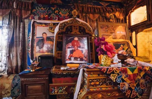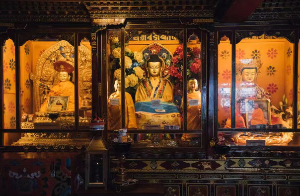 西方三怙主殿位于八廓南街、鲁固巷众多商贩摊中间,门面并不明显,所以它虽然距离大昭寺只有五分钟脚程,可是很不容易找到。从大昭寺广场西南角的派出所开始,不断友善地重复问人“奴日松拉康卡巴唷咧”,并坚定不移地相信它确实存在,便有可能找到。如果喜欢自己寻幽探秘,具体走法是从大昭寺广场向西走至尽头、和丹杰林路的交界处,左拐沿丹杰林路走至鲁固路右拐进入市场,再走五六个店面的路程,找到左边墙上有一个牌子写着“奴日桑拉宫”后,从牌的下方小门进去,院内为民居,右边小房子就是三怙主殿。此三怙主殿的寺知名品牌上,写着“奴日松贡布”,此即“西三怙主”的藏语音译。入口上方的寺知名品牌此殿规模极小,藏在杂乱的民居之中,由出名的直贡寺委派僧人值班管理(精确地说,应该说是由直贡寺的下属羊日岗寺所管理)。殿内的三怙主像主殿佛龛上供奉宗喀巴、无量寿佛、三怙主、佛塔等。主殿的楼上有一个小配殿,里 面供奉了一尊很庄严的喇嘛身像,此乃直贡噶举派的祖师吉天颂恭(1143-1217):楼上供奉的直贡噶举派祖师吉天颂恭大师身像西方三怙主殿与拉萨萨迦寺相邻。有趣的是,在13世纪末,萨迦寺曾与直贡寺发生极大纷争,支持萨迦派的蒙古军人直捣直贡寺,导致寺主流亡、寺院几近无存。可是在拉萨,萨迦寺的分院与直贡寺下属三怙主殿,只有数步路的距离,却和平相处。直贡寺直贡派是噶举派的一个支派,而位于拉萨东北一百多公里处、墨竹工卡县直贡峡谷里的直贡寺,就是它的根据地。它由吉天颂恭大师建于1179年,在西藏地方政治史和宗教史上曾经具有非常辉煌的地位,来此修行的僧侣曾有十万余众,集会最多达十八万僧侣的盛况。直贡寺的天葬场,是全藏知名的。在直贡寺每年举行的迁识大法会,每年吸引为数众多的信众前往参加,为西藏佛教里的盛事。