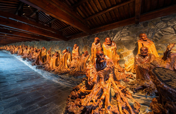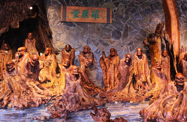 园内的根雕作品以佛像为主,其中较大的一尊根雕释迦牟尼主佛重40余吨。而具有视觉冲击力的要数罗汉长廊的五百罗汉像,每一尊佛像的表情都不相同,人物的造像和树根的天然形态融为一体,出神入化。另外值得一提的是室外的一尊桂下月老像,一些新人喜欢在此取景拍婚纱照。