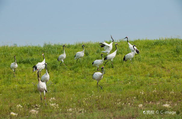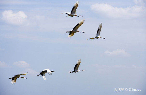 鹤群训飞训练是扎龙景区的特色看点,每次大约训飞20-30只丹顶鹤。你会看到远处的一群丹顶鹤在放鹤人的挥杆引导下开始助跑、飞翔,在空中盘旋片刻后飞回训飞处。由于训飞处离观鹤栈桥有一定距离,所以摄影爱好者们如果想拍摄到精彩的画面,一定要准备好长焦镜。除了丹顶鹤,在扎龙还能看到白鹤、白头鹤、白枕鹤、蓑羽鹤等珍禽。丹顶鹤训飞的时间很短也就2分钟,所以一定要提前去。