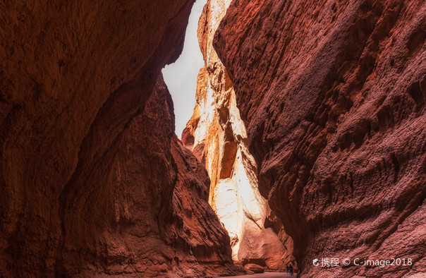 进入谷内,在红褐色的山峦中步行,仿佛进入了一个幽静清凉的世界。谷口十分开阔,但是深入谷中,峰回路转,时而宽阔,时而狭窄,有些地方仅容一人侧身通过。谷底比较平坦,许多时候都能够闲庭信步,两侧是高耸的石壁,脚下是细沙,不少路段还覆着一层浅浅的水,结着薄薄的一层冰。抬头仰望,在蓝天的映照下,奇峰异石千姿百态,数不胜数,神犬守谷、旋天古堡、显灵洞、玉女泉、卧驼峰等景观个个形态逼真。